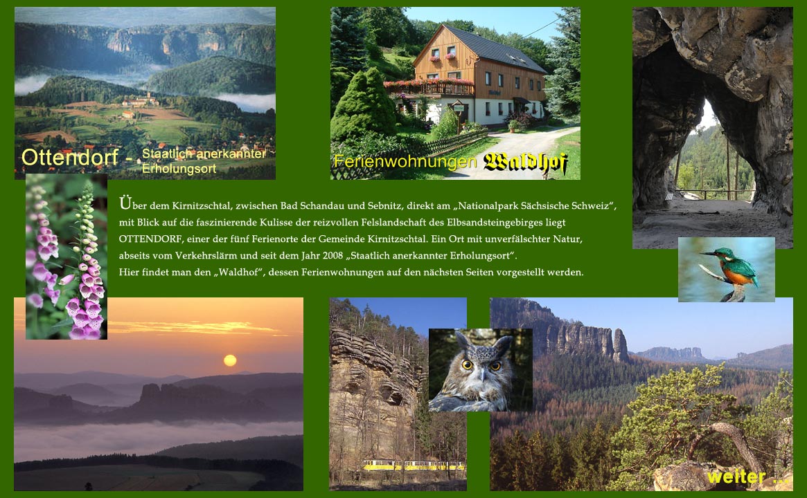 Unser HausUnser HausUhuAffensteine - Schrammsteine - FalkensteinEisvogelFingerhutOttendorf - Staatlich anerkannter ErholungsortSonnenuntergang - SchrammsteineKirnitzschtalbahnKleinsteinhöhleFerienwohnungen Waldhof